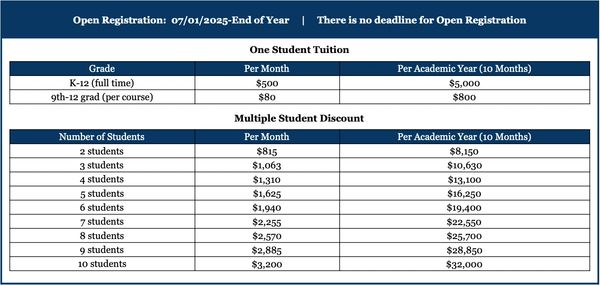 Fees for registration vary based on enrollment category: Preschool-12th grade students are required to pay a registration fee of $550. However, 9th-12th grade ala carte students and part-time preschool students (attending either 2 full days or 2 half days) are charged a reduced registration fee of $200. These fees reserve a student's spot and cover costs such as supplies and books. All registration fees are non-refundable.